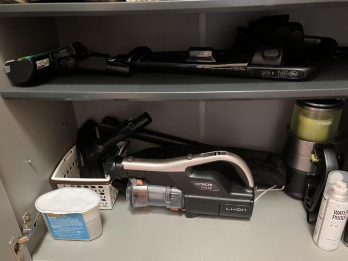なんとまあ!上の段にコンパクトに収納出来ましたよ\(^o^)/下のは以前の掃除機、まだ使える?ので置いておきます^^