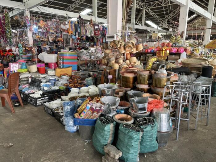 パクセーで最高の品揃えを誇る巨大市場です。びっしり並んだ露店で衣料品や食品、生活に必要なものは何でも売られています。特に、生鮮食品、肉、隣国から輸入された麺類、香辛料、そして特に目をひくのが地元メコン川でとれた新鮮な魚です。観光客向けではないのですが、見ているだけでも楽しめる市場です。パクセーに住む人々のリアルな生活を垣間見ることが出来る場所です。