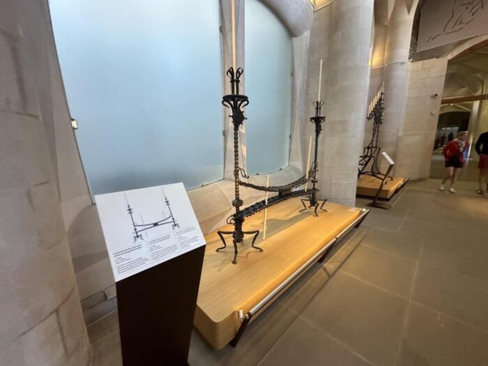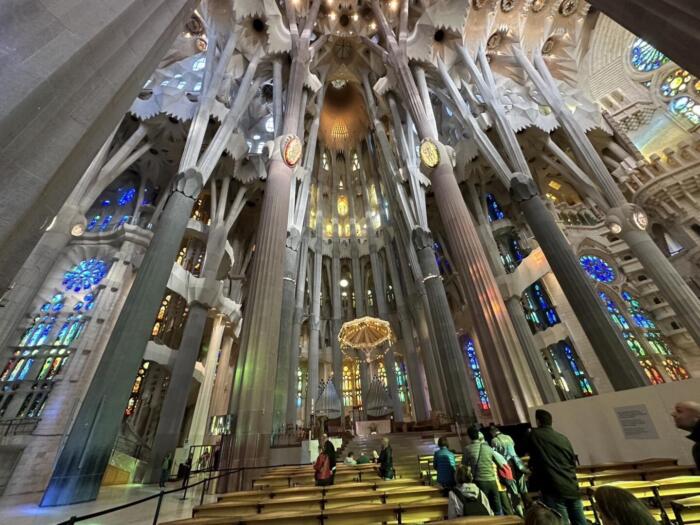 ガウディは教会内部を、木漏れ日が差し込む巨大な森を想像し設計しました。外観とは異なり、中は森の中にいるように、明るく色鮮やかな空間で、陽光が降り注ぎます。殉教のシンボルであるシュロの木を模した高い天井に埋め込まれているのは、ガウディ考案の採光器です。