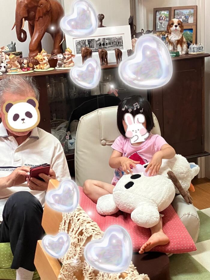 じいじの言うことをしっかり聞いて、ばあばがお昼ご飯の用意をしてくれるのを待っています^^ん!?なんかいたずらしてるよ!(^▽^;)