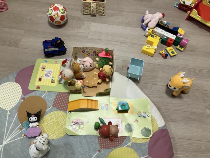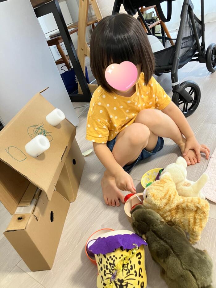 この日は段ボールでロボット?を作って、口の中に歯も描いて、ぬいぐるみたちとお食事会^^