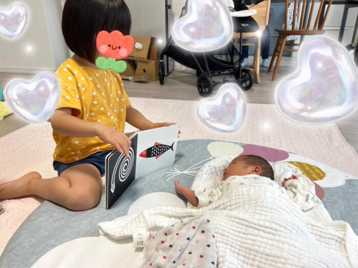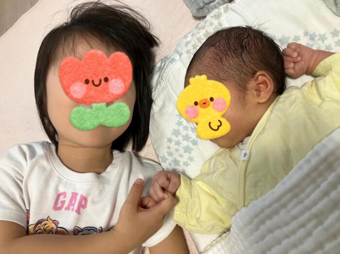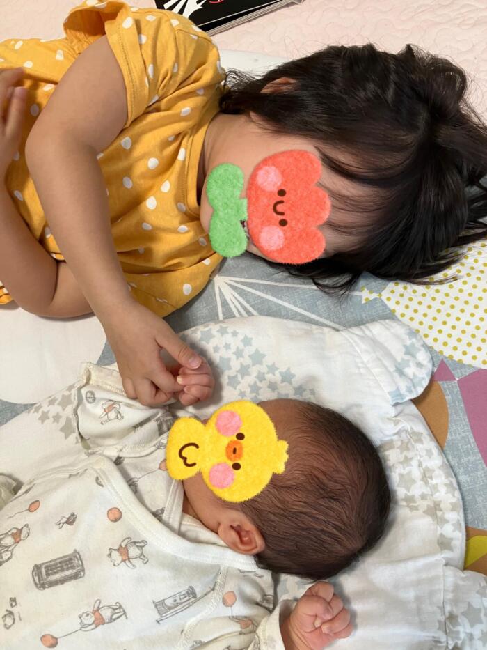 赤ちゃんが○○ちゃんの指をつかんでくるので、とっても嬉しそう(⋈◍>◡<◍)。✧♡