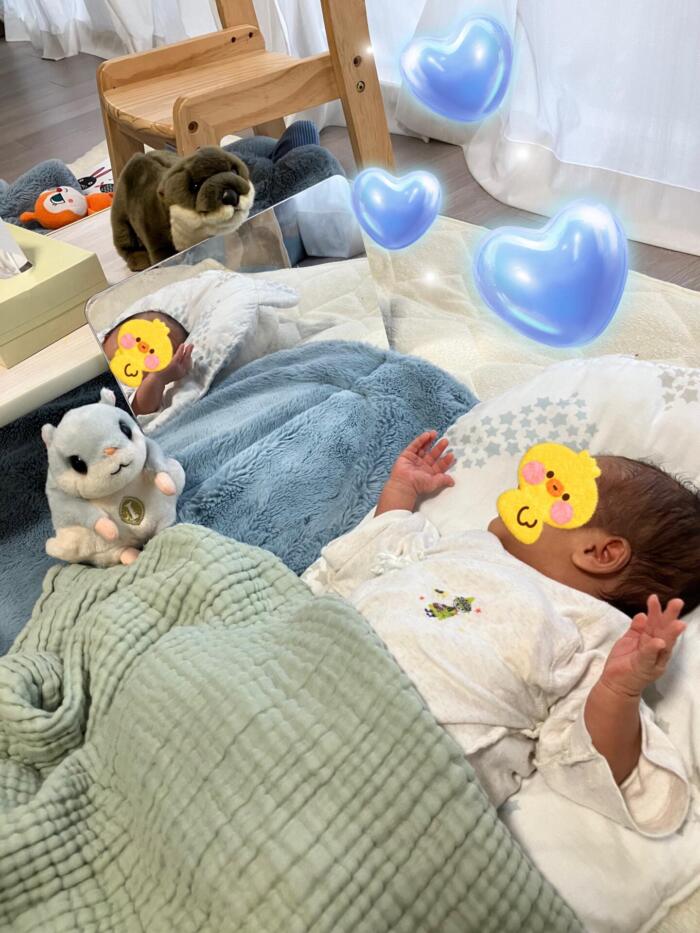 この日は、お気に入りのふわふわを広げて獣医さんごっこをしていたようです(^^♪その横で赤ちゃんが鏡を見ている!?^^