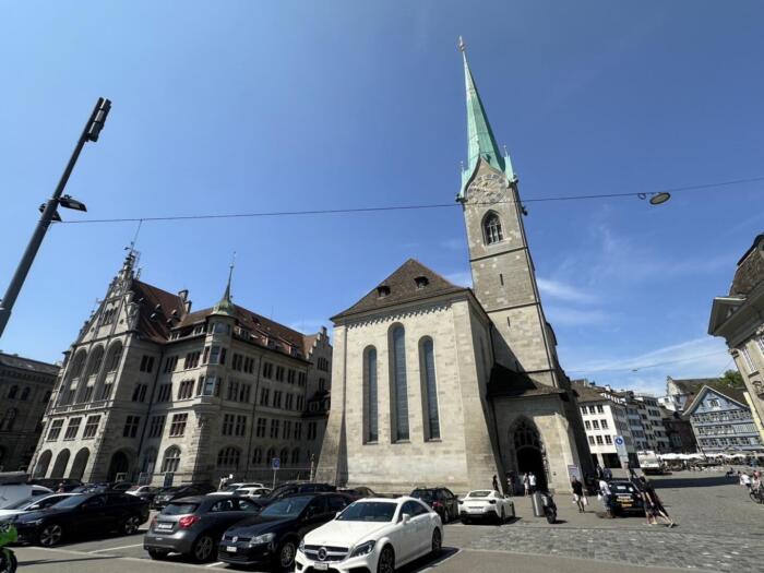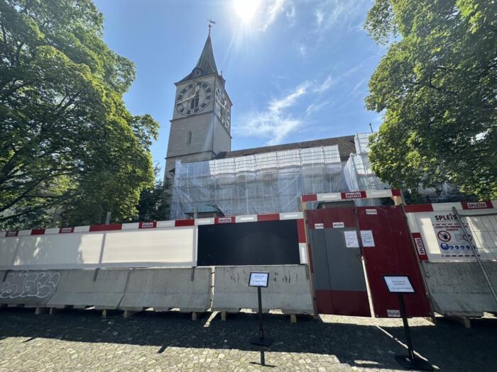 リトマ川のほとりにある時計台が印象的なチューリッヒで最も古い教会。時計はヨーロッパ最大規模の文字盤を誇り、時計が付いているロマネスク様式の塔は1534年に完成したもの。(工事中だったようです^^;)