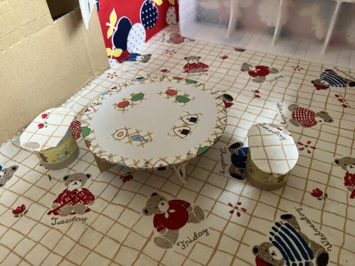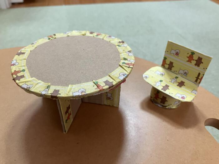 とりあえず、丸テーブルを作ってから、試行錯誤しながらイスらしきものを2脚作りました^^;