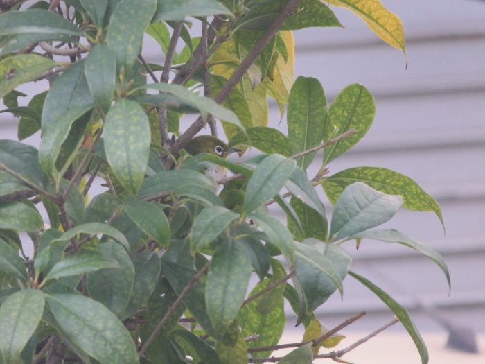 メジロちゃん、エサ台のある椿の木と